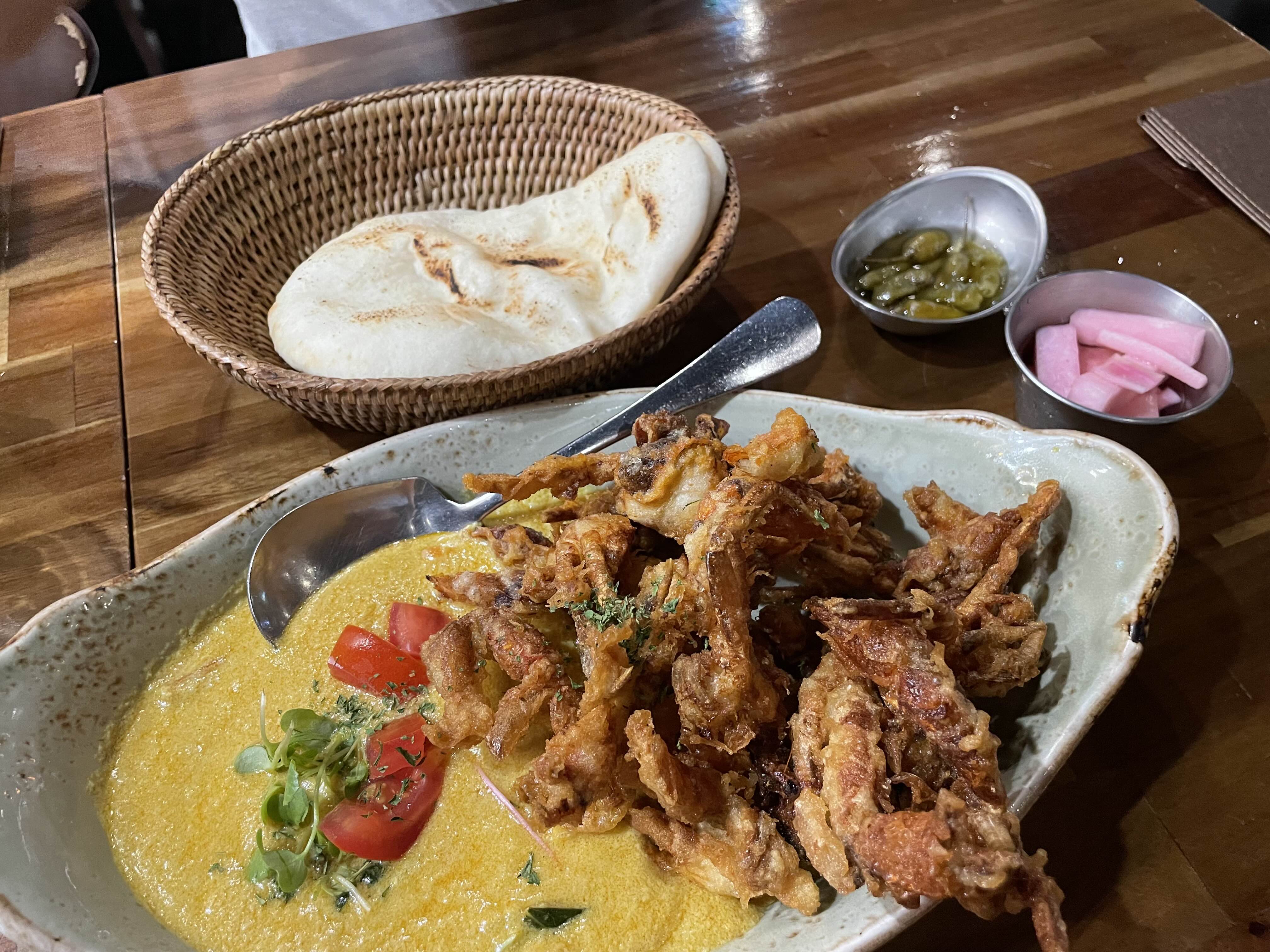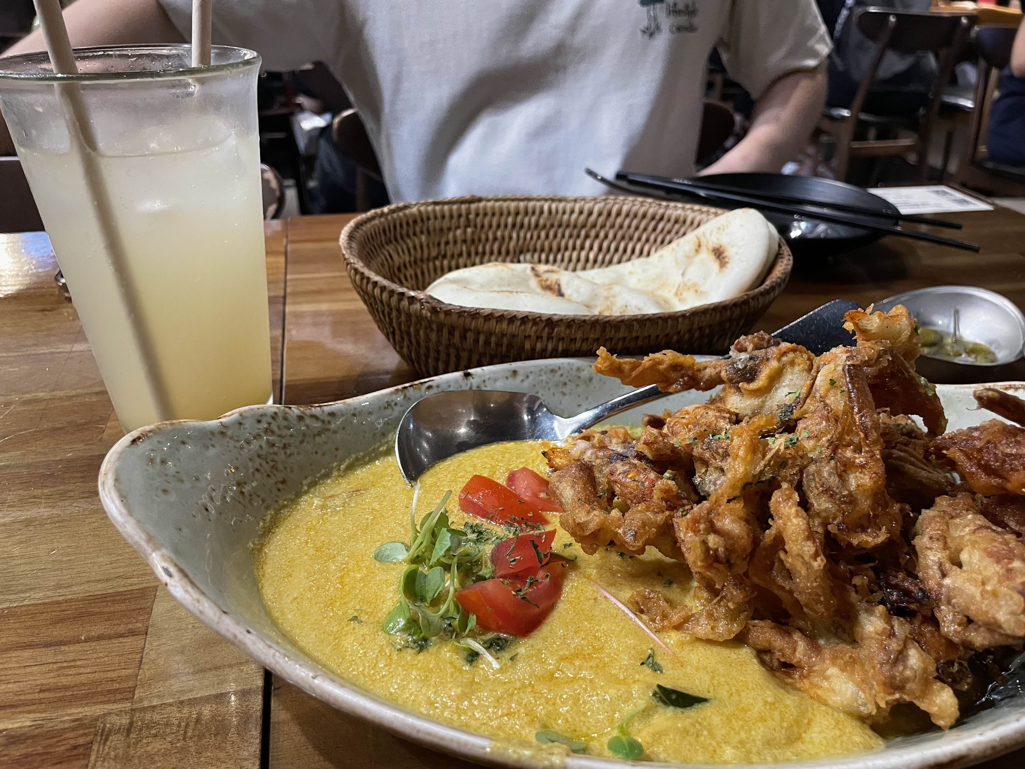 바삭한 소프트 크랩을 각종 야채와 커리소스로 곁들인 음식